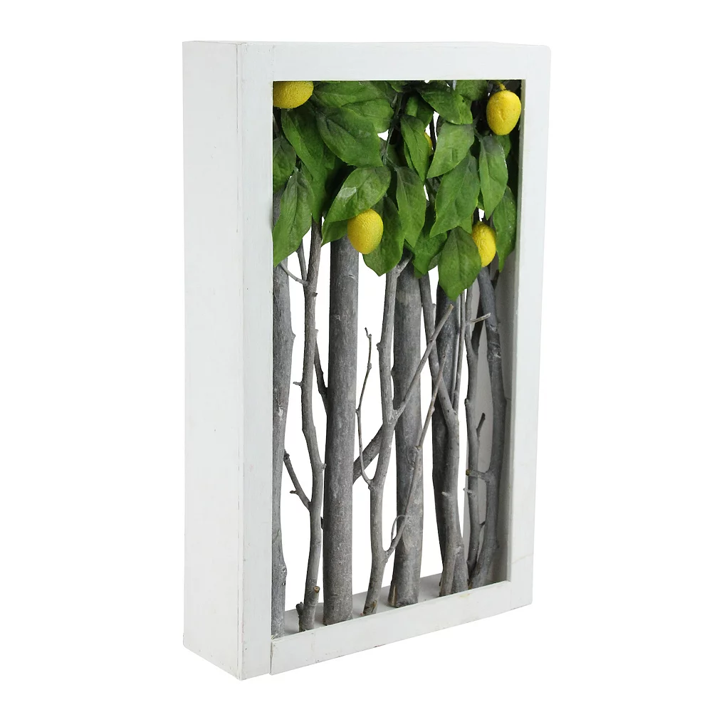 If you love nature and the outdoors this beautiful branch display is perfect for you. Featuring natural birch twigs standing upright in a decorative yet rustic white frame. Lemons and leaves rest atop the birch branches creating the appearance of lemon trees. The subtle pop of color from the lemons bring the piece to life. Dimensions: 14.5H x 9W x 2.5D. Material(s): birch wood/polyester/plastic