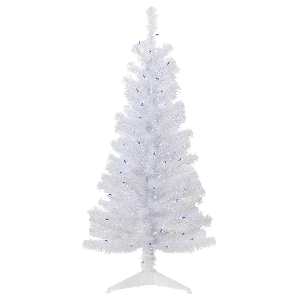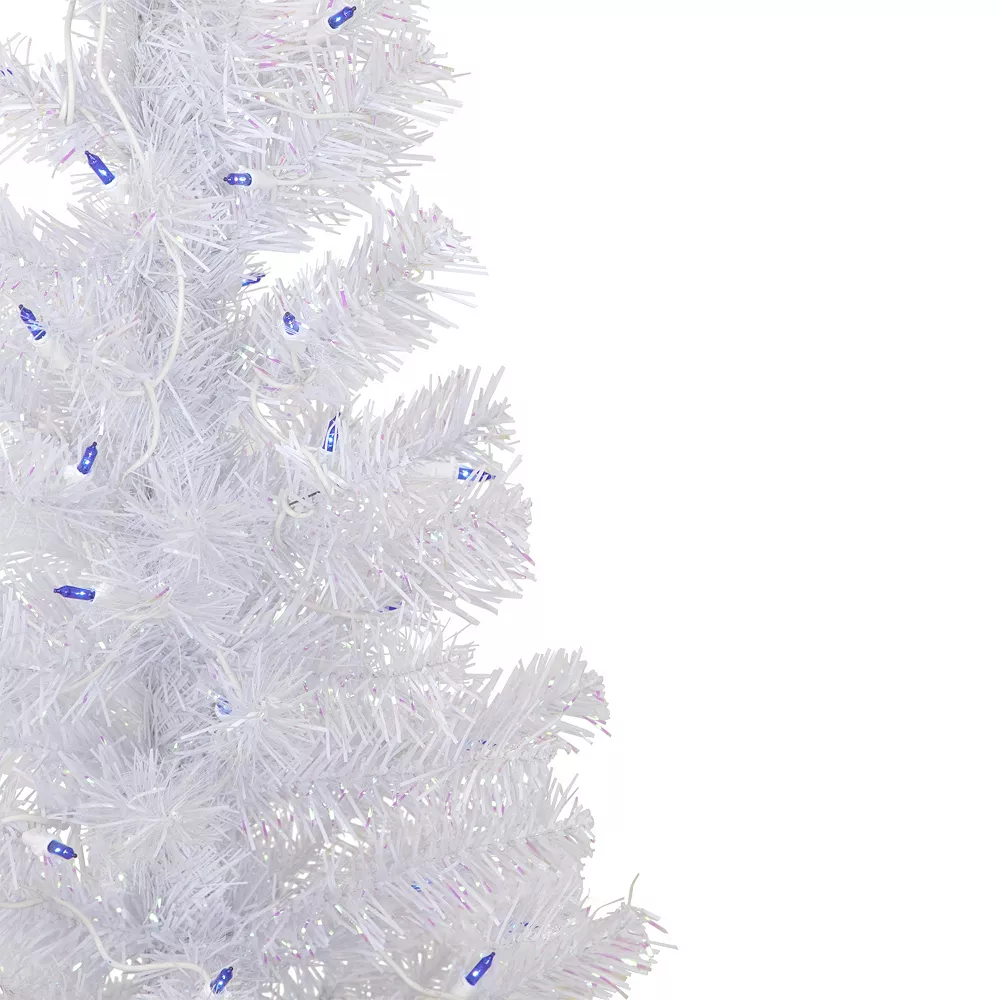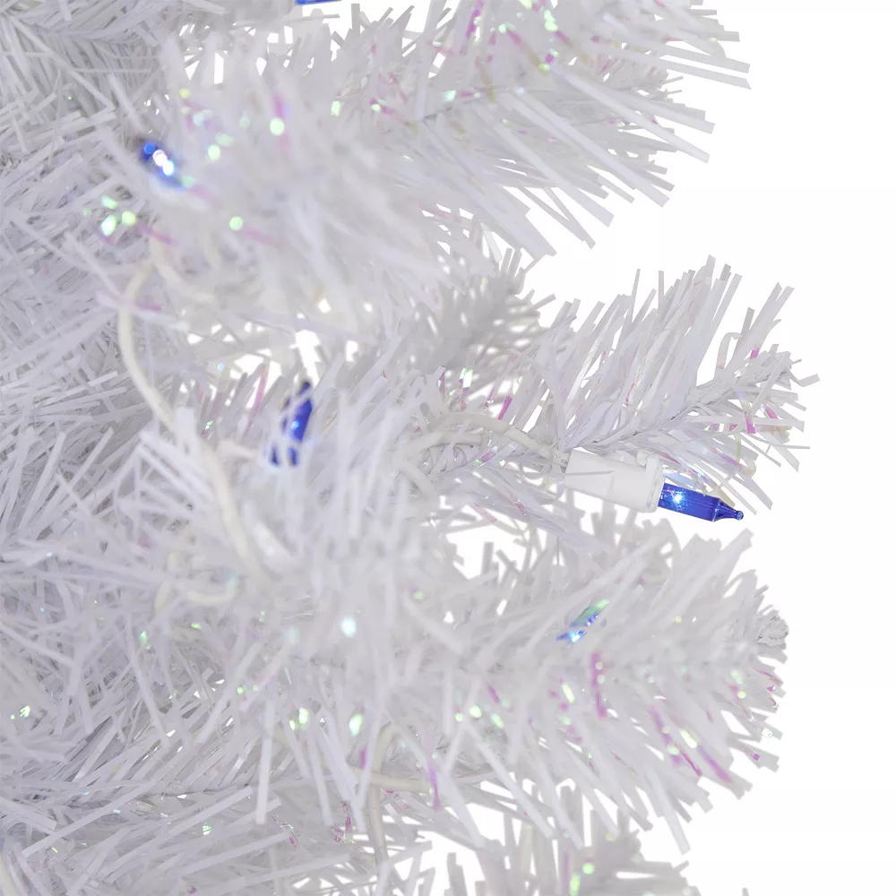 With its immaculate color and generous profile the Rockport White Pine Christmas tree glistens with wintry beauty. It is a designer-inspired alternative to a traditional green tree with its dazzling white pine needles. The branches contain a mix of matte white and clear iridescent needles that create texture and add depth to the tree. The iridescent needles beautifully reflect the soft glow from the blue incandescent mini lights. This tree is perfect for a quick and easy setup and ideal for corners or tabletops. Product Features: Pre-lit with 70 blue lights. Bulb size: mini. Bulb type: incandescent. 110 tips. 2 wide branch tips. 30 white lead cord. Slim profile tree. Additional Product Features: If one bulb burns out the rest will stay lit. Light sets on tree are UL listed for indoor or outdoor use however the tree itself is recommended for indoor use only. Lights are equipped with Lamp Lock feature which makes them replaceable interchangeable and keep them from falling out. Contains 1 plug with end connector. Connector allows to stack multiple lighted items together (not to exceed 210 watts). 3-piece easy assembly (including stand). Includes a white plastic tree stand. Wire gauge: 22. 120 volts 60 hertz .24amps 28.8 watts. Dimensions: 4′ high (from the base of the stand to the top of the tree). Distance from floor to the first row of branches: 7. 24 base diameter (at the widest point). Material(s): PVC/plastic/glass bulbs/wire. Note: Branches are compressed for shipment and need to be fluffed out upon arrival to look like the photo.