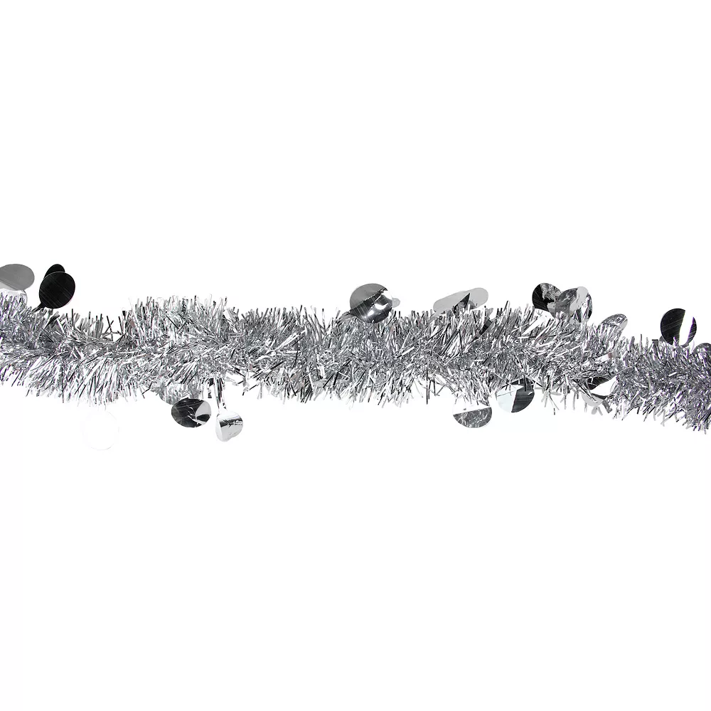 Nothing says Christmas like a good old fashioned tinsel garland! This silver garland will add shine and shimmer to your holiday decor. Perfect for decorating trees mantles and railings. Product Features: Unlit. Christmas tinsel garland. Decorated with shiny silver round accents. Flame and tarnish resistant. 5 ply garland. For indoor use or covered outdoor use. Dimensions: 50′ long x 2.5 wide. Material(s): tinsel