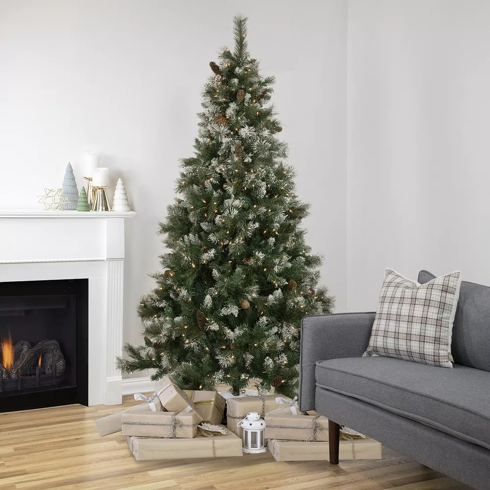 Bring the beauty of winter into your home with this frosted artificial Snow Valley pine tree. Crafted from traditional green pine needles mixed with long needle pine to create depth and fullness. The branches have a frosted feature that mimics a real tree in nature after a light snowfall. The added pine cones create a rustic feel to any decor style. The dazzling clear incandescent mini lights add some extra sparkle to the tree and the surrounding area. Sure to impress your guests wherever you place it. Product Features: Pre-lit with 600 clear lights. Bulb size: mini. Bulb type: incandescent. 907 mixed tips. 3 wide tips. 36 green lead cord. Additional Product Features: Medium profile tree. Hinged branch construction. Light sets on tree are UL certified and approved for indoor or outdoor use however the tree itself is recommended for indoor use. If one bulb burns out the rest will stay lit. Lights are equipped with Lamp Lock feature which makes them replaceable interchangeable and keeps them from falling out. 4-piece easy assembly (including stand). Comes with replacement bulbs and spare fuses. Comes with free metal tree stand. Dimensions: 6.5′ high (from the base of stand to the top of the tree). 45 base diameter (at the widest point). Material(s): PVC/metal/bulbs/wire. Note: Branches are compressed for shipment and need to be fluffed out upon arrival to look like the photo.
