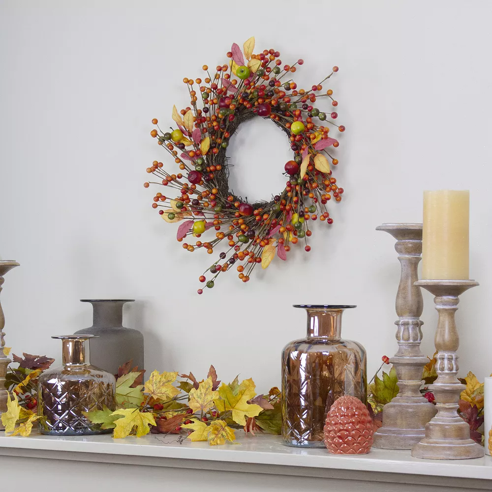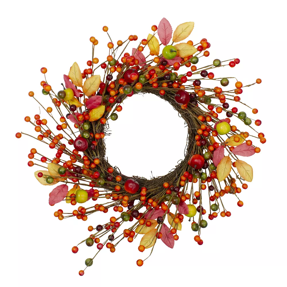 This gorgeous harvest wreath showcases all the wonderful colors of Autumn. Featuring orange and yellow berries with a touch of foliage and apples. Perfect for hanging or used as part of your Thanksgiving table centerpiece. Product Features: Unlit. Mixed berries leaves and apples. Recommended for indoor use only. Sturdy twig backing for easy hanging – hardware not included. No assembly required – wreath comes in 1 piece. Dimensions: 18 diameter (measured from outermost tip/edge to outermost tip/edge across the wreath). Material(s): polyester/wire/foam/twigs