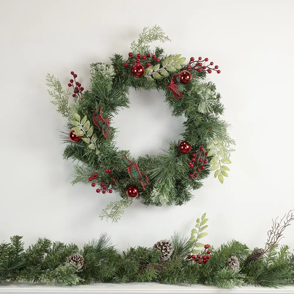 With the hustle and bustle of the Holiday you may not have enough time to fully decorate your home this season. This lovely pre-decorated green pine wreath will make this year’s decorating a breeze. This wreath is accented with frosted pine cones berries and ribbons. This wreath is perfect for hanging on walls on a door or adding candles and creating a unique table decoration. This wreath will be a great addition to your holiday decor for many years. Product Features: Unlit. 1.25 – 3.25 wide tips. Recommended for indoor use only. No assembly required – wreath comes in 1 piece. Includes a heavy duty ring metal frame backing for hanging. Dimensions: 24 in diameter. Inner ring dimension: 13 diameter. Material(s): PVC/plastic/wire. Note: Branches are compressed for shipment and need to be fluffed out upon arrival to look like the photo.