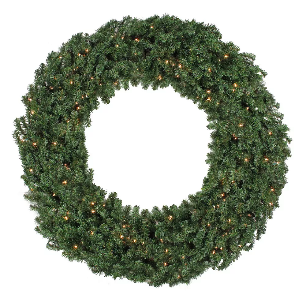 This classic Canadian pine is made up from two-tone forest green tips for a lush full and dimensional look. Super bright bulbs create the perfect wintry lighting for that special holiday feeling. Its commercial size makes it ideal for outdoor residential spaces or commercial buildings. Product Features: Pre-lit with clear lights. Bulb size: mini. Two-tone medium green foliage. 4200 tips. 1.75 wide tips. Easy assembly. Wreath comes in 4 pieces with hardware included. Heavy duty triple ring metal frame for hanging. green lead cord. Additional Product Features: Flame retardant. Super bright bulbs. If one bulb burns out the rest will stay lit. Contains 1 plug with end connector which allows you to stack multiple lighted items together (not to exceed 210 watts). UL certified and approved for indoor or outdoor use. Comes with replacement bulbs flasher bulbs and spare fuses. 120 volts 60 hertz .34 amps 40.8 watts. Dimensions: 120 diameter (measured from outermost tip to outermost tip across the wreath). Material(s): PVC/metal/glass bulbs/wire. Note: Branches are compressed for shipment and need to be fluffed out upon arrival to look like the photo.