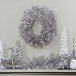 Christmas Central 24″ Silver Tinsel Artificial Christmas Wreath Clear Lights