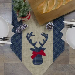 Christmas Central 80″ Blue And Brown Burlap And Plaid Reindeer Christmas Table Runner