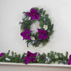 Christmas Central Purple Poinsettia And Silver Pine Cone Artificial Christmas Wreath – 24-Inch Unlit