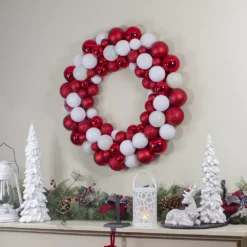 Christmas Central White And Red 3-Finish Shatterproof Ball Christmas Wreath – 24-Inch Unlit